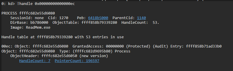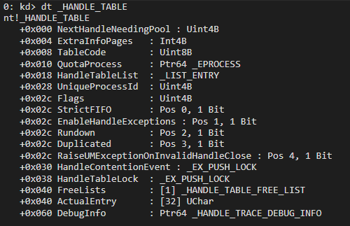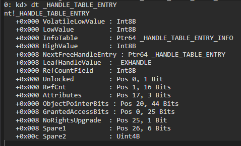 Yes. That is what we like to see. But there is one problem. The GrantedAccess is 0. The handle is created with 0 access rights. That means we need to access the _HANDLE_TABLE_ENTRY structure and change those bits we’ve seen earlier.