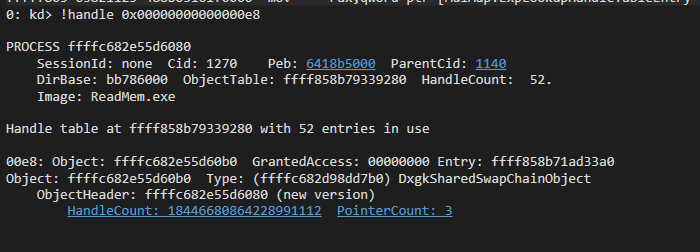 As we’ve seen from above, _HANDLE_TABLE_ENTRY has an interesting field named as ObjectPointerBits. It also has a GrantedAccessRights, which was a nice target for a lot of people. But not what our point is. HxPosed gives you kernel access anyway. Who cares about handles?