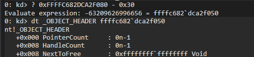 The ObjectPointerBits field returns the OBJECT_HEADER. Not the object itself. Nice for us, the object body itself is exactly right after the OBJECT_HEADER structure. So if we advance 0x30 bytes from the OBJECT_HEADER, we will get the object!